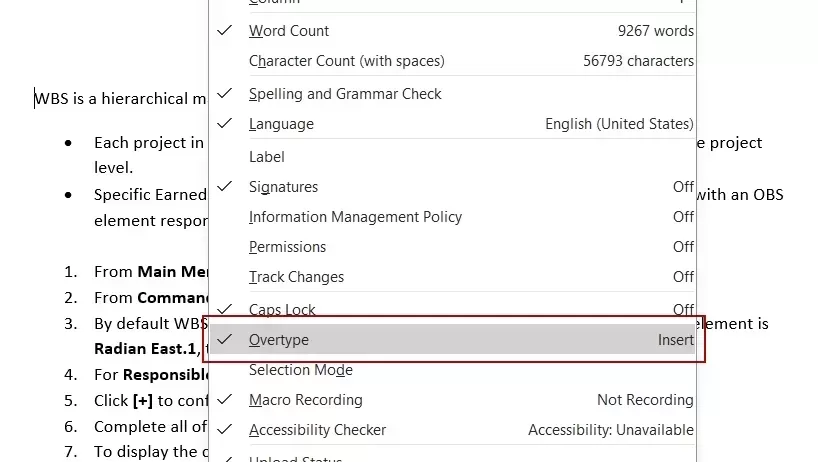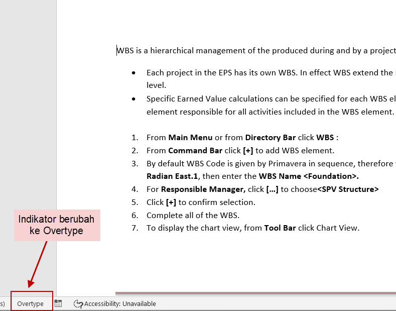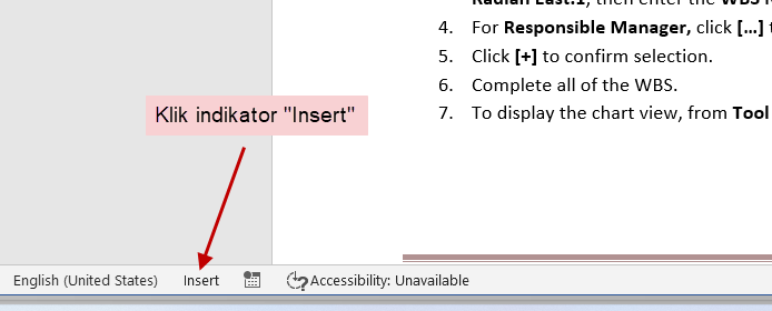 Setelah itu akan muncul indikator Insert pada Status bar. Klik pada indikator Insert untuk berpindah ke Overtype.