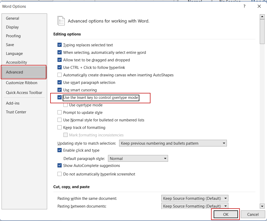 Klik File > Options > Advanced. Pilih pilihan Use the Insert key to control overtype mode, klik OK.