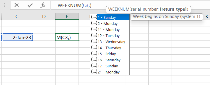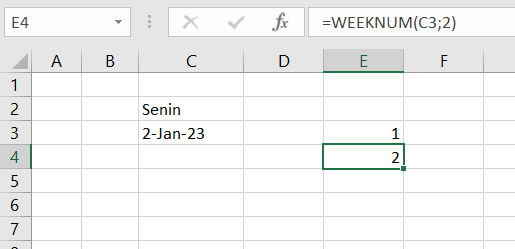 Pada contoh di atas tipe_kembali bernilai 2, artinya perhitungan minggu dimulai di hari Senin. Tanggal 2 Januari 2023 jatuh pada Senin, sehingga tanggal 1 Januari 2023 merupakan Minggu I dan tanggal 2 masuk ke Minggu II.