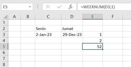 Pada contoh di atas tanggal 29 Desember 2023 merupakan minggu ke 52 jika permulaan minggu jatuh pada hari Minggu.