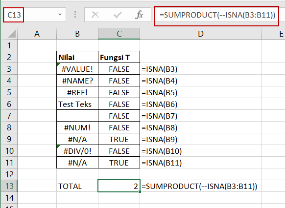 Pada contoh di atas, ISNA dikombinasikan dengan SUMPRODUCT untuk menghitung total sel bernilai #N/A.