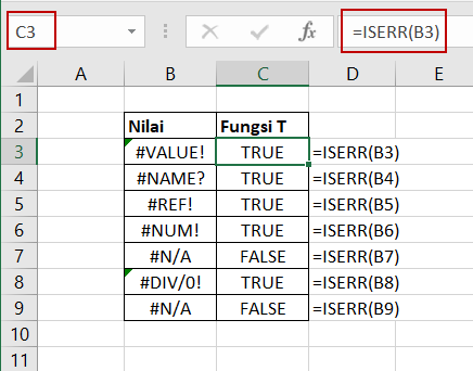 Fungsi ISERR dapat digunakan untuk mengecek nilai error pada sel kecuali #N/A. Untuk menggunakan fungsi ISERR, caranya: