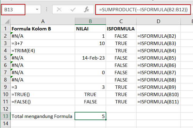 Contoh di atas merupakan gabungan fungsi ISFORMULA dan SUMPRODUCT, untuk menghitung total rentang B2:B12 yang mengandung formula.