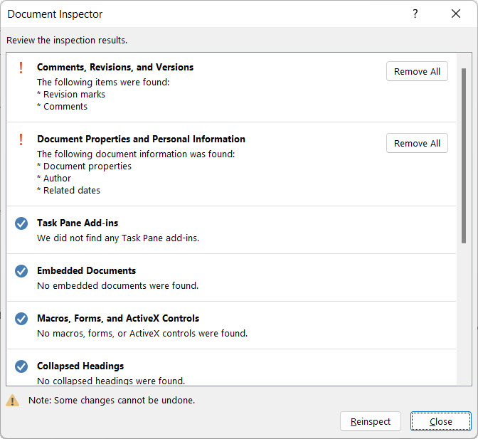 Yang perlu diperhatikan adalah ketika Anda mengklik Remove All, maka perubahan yang sudah diproses tidak dapat di-undo. Jadi sebaiknya sebelum melakukan Inspect Document, Anda dapat membuat backup file terlebih dulu.