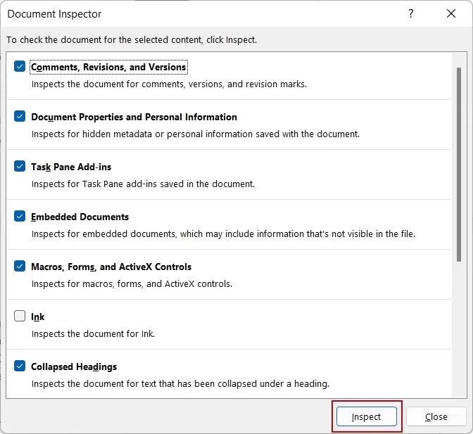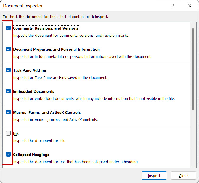 Selanjutnya akan muncul window Document Inspector pada Word. Selanjutnya, pilih (cek) kategori yang akan dicek dengan mencentang kotak di samping kiri kategori pilihan.