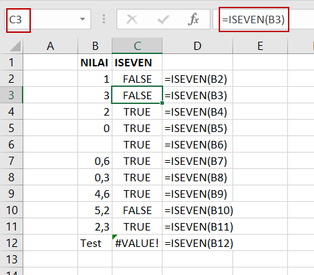 C3=ISEVEN(B3)