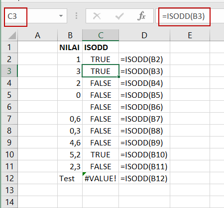 Fungsi ISODD akan bernilai TRUE jika suatu bilangan terdeteksi ganjil dan akan bernilai FALSE, jika tidak terdeteksi ganjil.