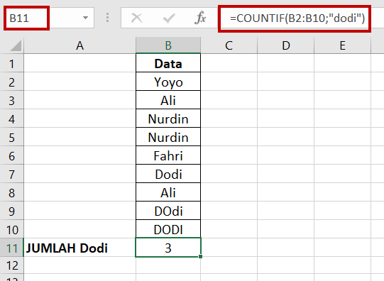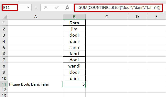 B11=SUM(COUNTIF(B2:B10;{“dodi”;”dani”;”fahri”}))