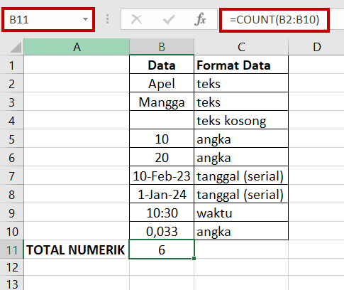 Pada gambar contoh di atas, fungsi COUNT menghitung sel yang mengandung numerik termasuk angka dan tanggal dari B2:B10, ditemukan 6 sel mengandung numerik. Sel kosong dan teks tidak dihitung.