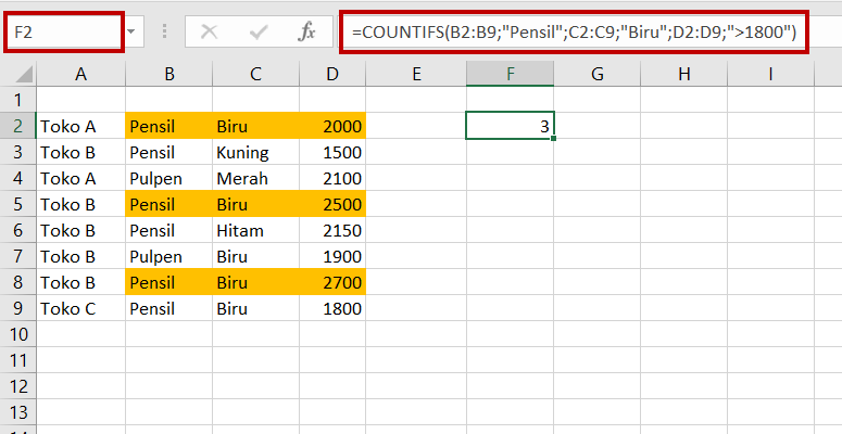 F2=COUNTIFS(B2:B9;”Pensil”;C2:C9;”Biru”;D2:D9;”>1800″)