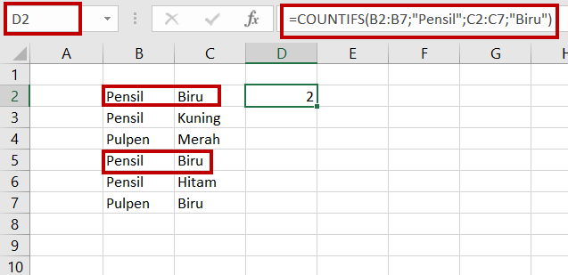 D2=COUNTIFS(B2:B7;”Pensil”;C2:C7;”Biru”)