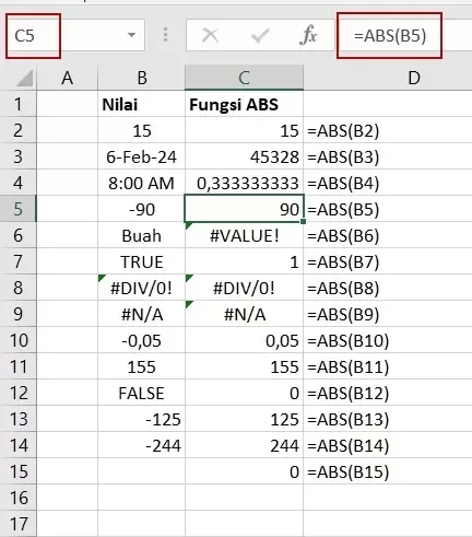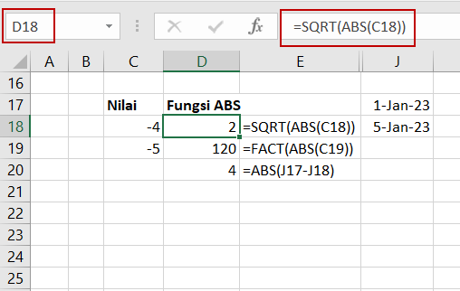Pada contoh di atas, fungsi ABS mengubah nilai negatif menjadi positif serta mengubah tanggal, waktu dan logika menjadi angka.
