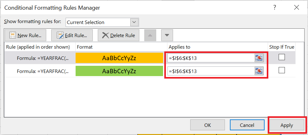 - Isi kolom Applies to sesuai range table yang Anda buat di Excel Anda. Pada contoh range table berada di area =$I$6:$K$13.